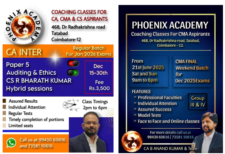 We empower aspiring finance professionals with expert guidance, personalized mentoring, and innovative study methods. Our state-of-the-art classrooms and flexible online learning options cater to every student’s needs. With over a decade of academic excellence, we provide comprehensive study materials, regular tests, and dedicated support to help you excel in CA Foundation, Intermediate, Final, and CMA courses. Join our thriving community committed to your success and take the first step toward a rewarding career in accounting and finance at Phoenix Academy.